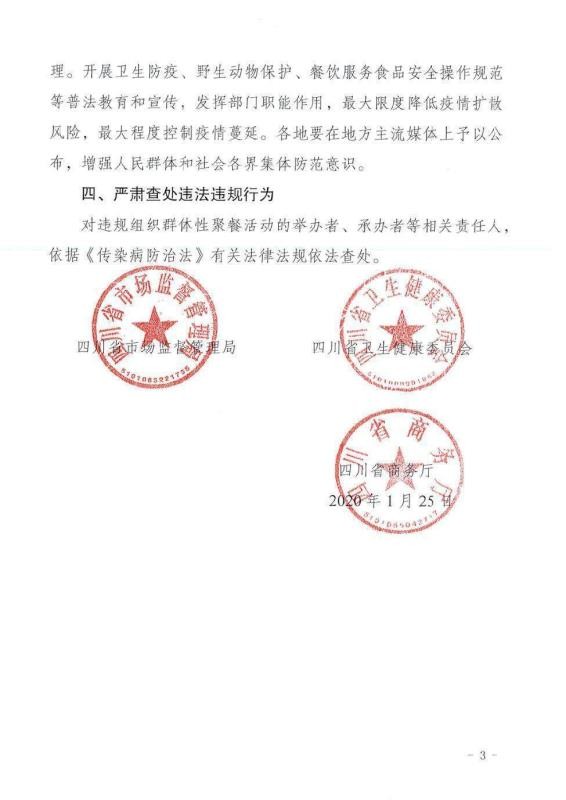 四川新聞網成都1月25日訊(記者 李丹)1月25日,四川省市場監督管理局、四川省衛生健康委員會、四川省商務廳3部門聯合發布緊急通知,近期新型冠狀病毒感染的肺炎疫情防控形勢嚴峻,為認真貫徹落實省委省政府關于啟動重大突發公共衛生事件一級響應措施暨應對新型冠狀病毒感染的肺炎疫情決策部署,有效保證廣大群眾生命安全,根據《傳染病防治法》等有關法律法規,禁止任何餐飲單位和個人舉辦任何形式的群體性聚餐活動,已經訂餐的應盡快取消或延期舉辦。