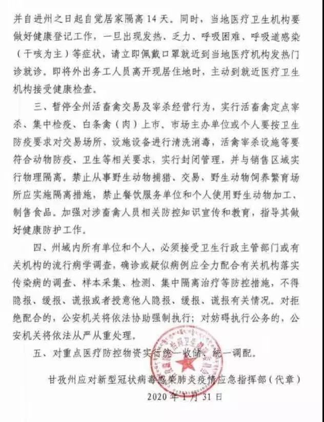 一、暫停各類群體性聚集活動。具有交叉感染風險的經營單位,如歌舞娛樂、電影院、游戲游藝、洗浴場所、互聯網上網服務場所、營業性麻將場所和兒童游樂設施、健身房、室內游泳場(館)等暫停營業,景區景點、文化館、圖書館、博覽館、宗教活動場所暫停對外開放,暫停涉旅企業組織的團隊旅游活動。暫時禁止群體性聚餐(含農村自辦群體性宴席)。廣大公眾應正確佩戴口罩,自覺將廢棄口罩進行毀損并按有害垃圾處置。二、加強村(社區)網格化管理,對可能的傳染源要找得到、管得住、服務好。發熱病人以及來自疫區人員應積極配合村(社區)的排查檢疫工作安排。凡2020年1月10日以來,來自湖北或有過湖北等疫區旅居史的,請即刻報告所在村委會(社區)登記備案,并自進州之日起自覺居家隔離14天。同時,當地醫療衛生機構要做好健康登記工作,一旦出現發熱、乏力、呼吸困難、呼吸道感染(干咳為主)等癥狀,請立即佩戴口罩就近到當地醫療機構發熱門診就診。即將外出務工人員離開現居住地時,主動到就近醫療衛生機構接受健康檢查。三、暫停全州活畜禽交易及宰殺經營行為,實行活畜禽定點宰殺、集中檢疫、白條禽(肉)上市。市場主辦單位或個人要按衛生防疫要求對交易場所、設施設備進行清洗消毒,活禽宰殺設施等要符合動物防疫、衛生等相關要求,實行封閉管理,并與銷售區域實行物理隔離。禁止從事野生動物捕獵、交易,野生動物飼養繁育場所應實施隔離措施,禁止餐飲服務單位和個人使用野生動物加工、制售食品。加強對涉畜禽人員相關防控知識宣傳和教育,指導其做好健康防護工作。四、州域內所有單位和個人,必須接受衛生行政主管部門或有關機構的流行病學調查,確診或疑似病例應全力配合有關機構落實傳染病的調查、樣本采集、檢測、集中隔離治療等防控措施,不得隱報、緩報、謊報或者授意他人隱報、緩報、謊報有關情況。對拒絕配合的,公安機關將依法協助強制執行;對妨礙執行公務的,公安機關將依法從嚴從重處理。