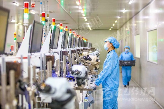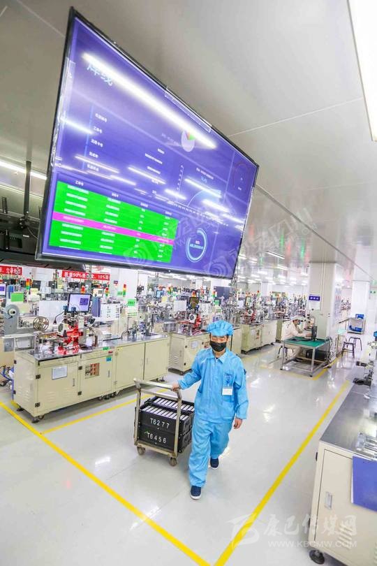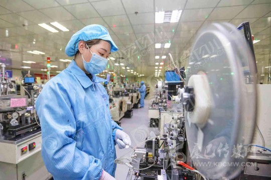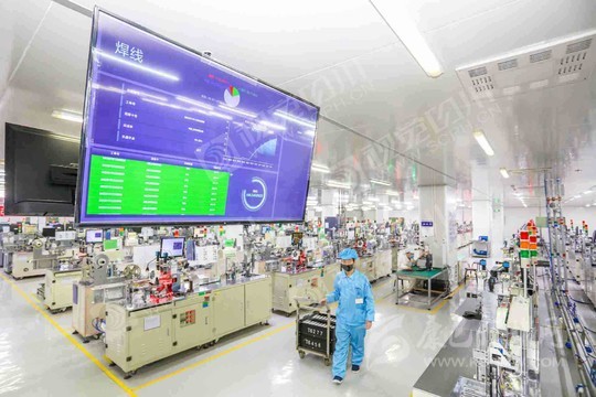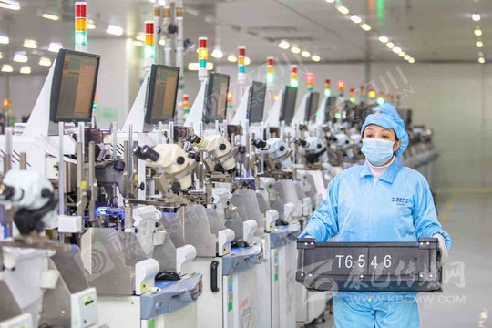 遂寧市經開區藍彩電子智能信息化車間,工人正在生產線開足馬力加緊生產。