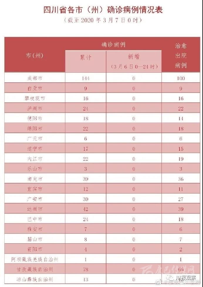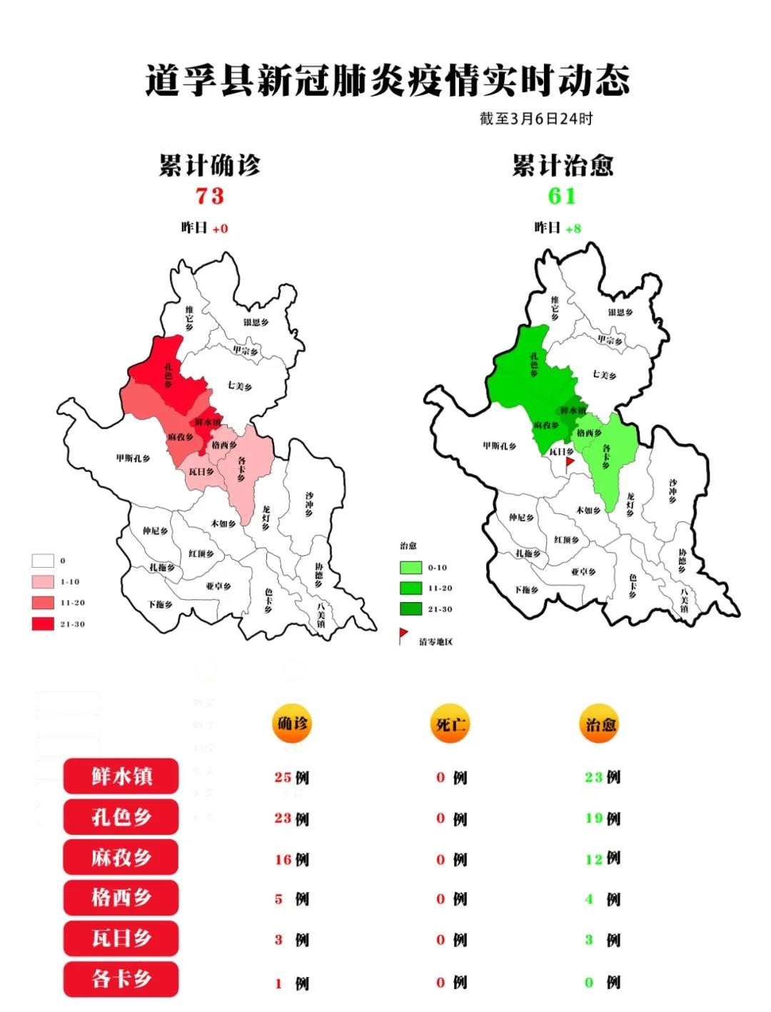各縣(市)確診病例情況表 疫情實時追蹤 (截至2020年3月6日24時)縣(市) 累計病例 新增病例 道孚縣 73 0 康定市 2 0 色達縣 2 0 稻城縣 1