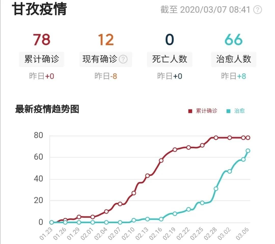 截至3月6日24時,我州累計報告確診病例78例,累計治愈出院66人(道孚縣61人、康定市2人、色達縣2人、稻城縣1人),其余12人均在定點醫院隔離治療,25名密切接觸者正在接受醫學觀察。我州道孚縣連續8天無確診病例報告,其余17個縣(市)連續32天無確診病例報告。