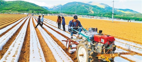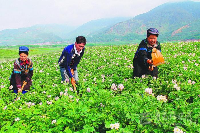 ▲村民在布拖縣拖覺鎮日拍村萬畝馬鈴薯高產示范基地里除草。該縣是四川省優勢特色馬鈴薯生產基地。 (攝于2013年6月)
