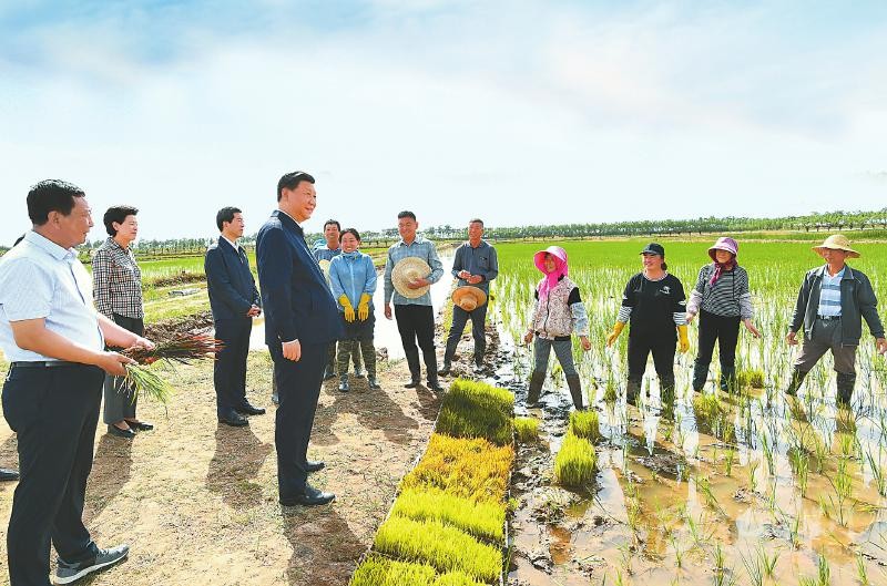 6月9日下午,習近平在銀川市賀蘭縣稻漁空間鄉村生態觀光園,同正在勞作的村民親切交談。 新華社 發