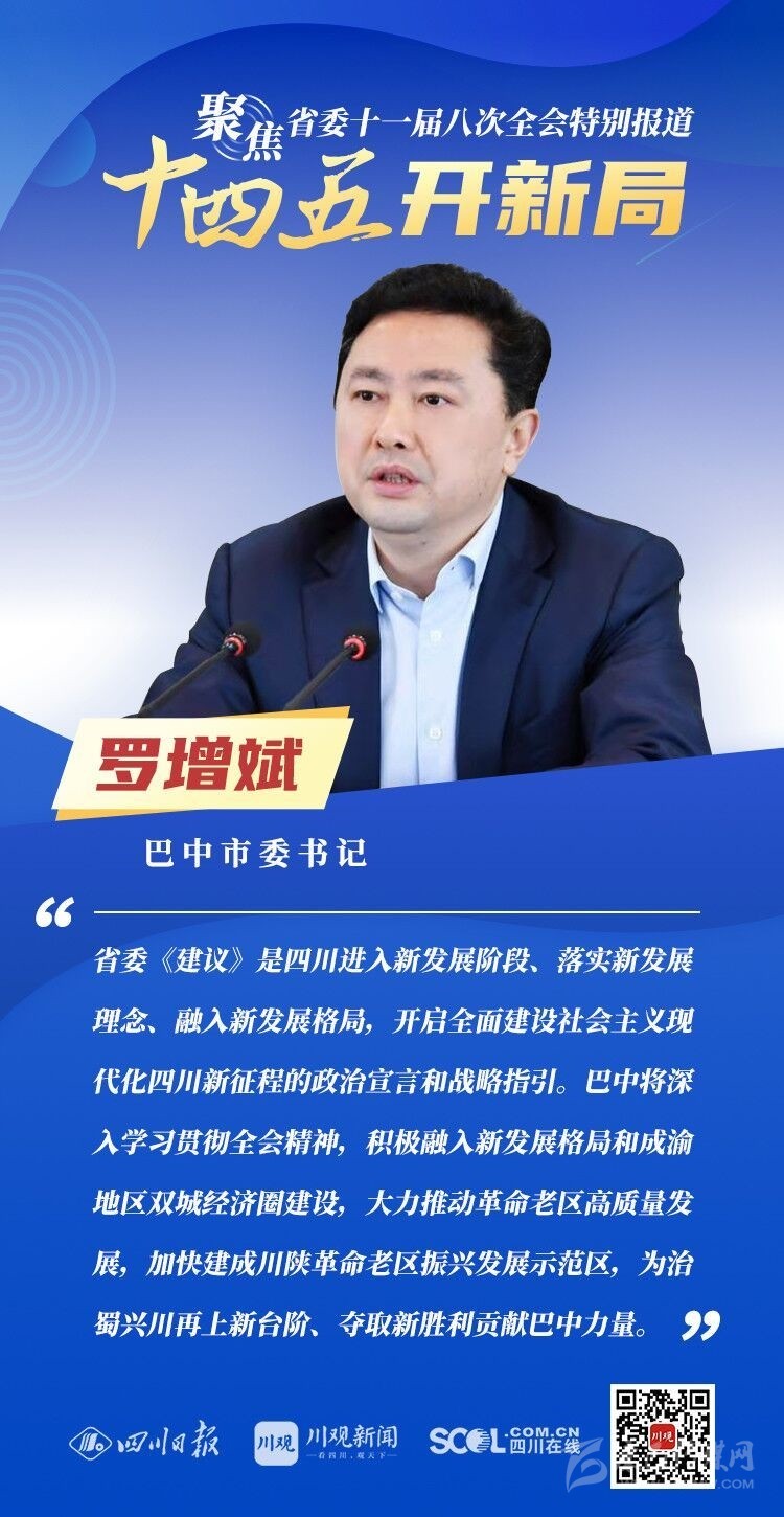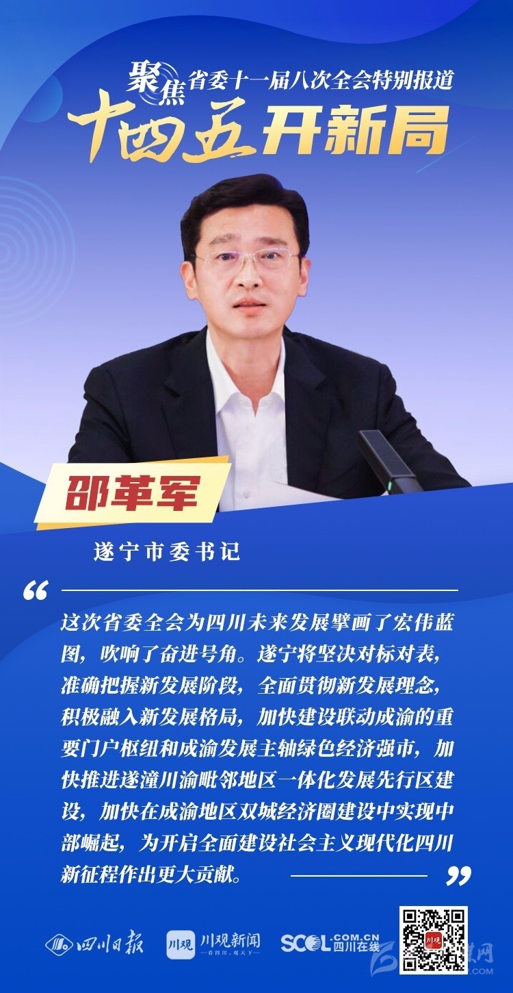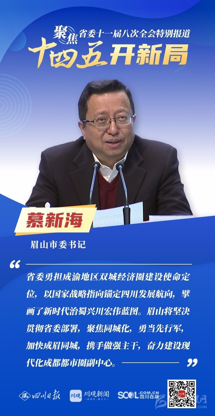 12月3日,中共四川省委十一屆八次全會在成都開幕,全會將深入學習貫徹黨的十九屆五中全會精神,審議《中共四川省委關于制定四川省國民經濟和社會發展第十四個五年規劃和二〇三五年遠景目標的建議(討論稿)》,為未來5年乃至更長時期四川發展謀劃新藍圖 。