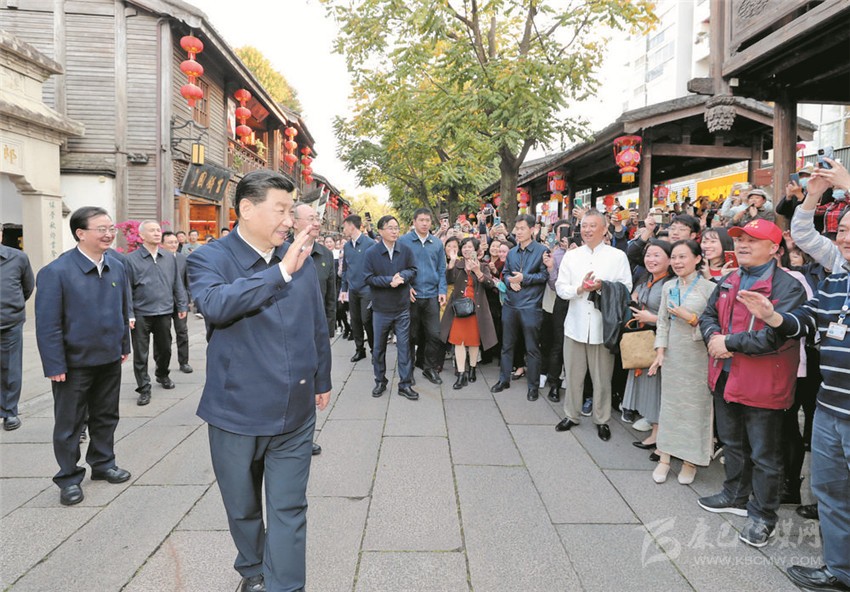 習近平在福州三坊七巷歷史文化街區考察時,向游客和市民招手致意。