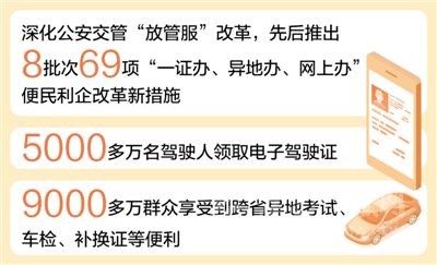 今年12月2日是第十個“全國交通安全日”,最新數(shù)據(jù)顯示,我國機(jī)動車和駕駛?cè)藬?shù)量持續(xù)增長,目前機(jī)動車保有量已達(dá)3.93億輛,駕駛?cè)诉_(dá)4.79億人。面對道路交通大發(fā)展的新形勢、人民群眾日益增長的新需求,公安部不斷深化公安交管“放管服”改革,先后推出8批次69項(xiàng)“一證辦、異地辦、網(wǎng)上辦”便民利企改革新措施,為群眾和企業(yè)減少辦事成本800多億元。