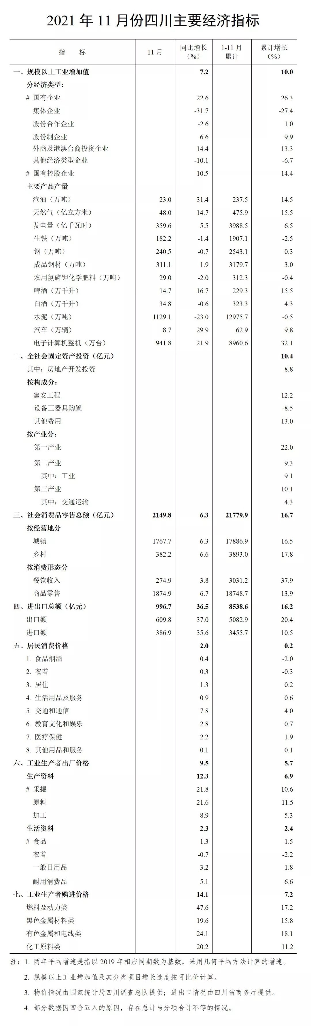 12月16日,四川省統計局官微發布《2021年1-11月四川省國民經濟主要指標數據》,具體如下: