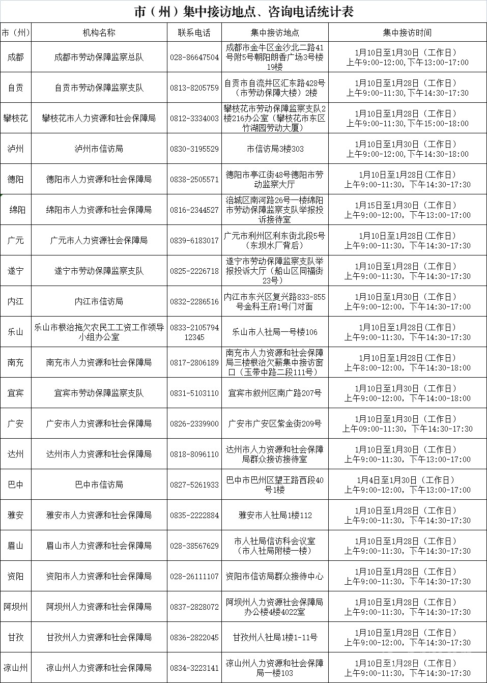 為深入推進“我為群眾辦實事”活動,進一步暢通舉報投訴渠道,壓實各地各有關部門責任,切實做好春節前保障農民工工資支付工作。從1月10日起,四川省開展拖欠農民工工資舉報投訴集中接訪活動啟動。省級層面,省根治拖欠農民工工資工作領導小組辦公室組織人力資源和社會保障廳、住房和城鄉建設廳等10家成員單位有關負責人集中接訪問,各市(州)也同步開展集中接訪活動。