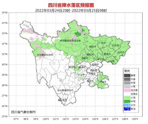 明天(3月25日)白天,盆地各市陰天轉多云,西部沿山有分散小雨;阿壩州大部、甘孜州北部東部陰天間多云有小雨(雪),甘孜州其余地方和攀西地區多云間晴。