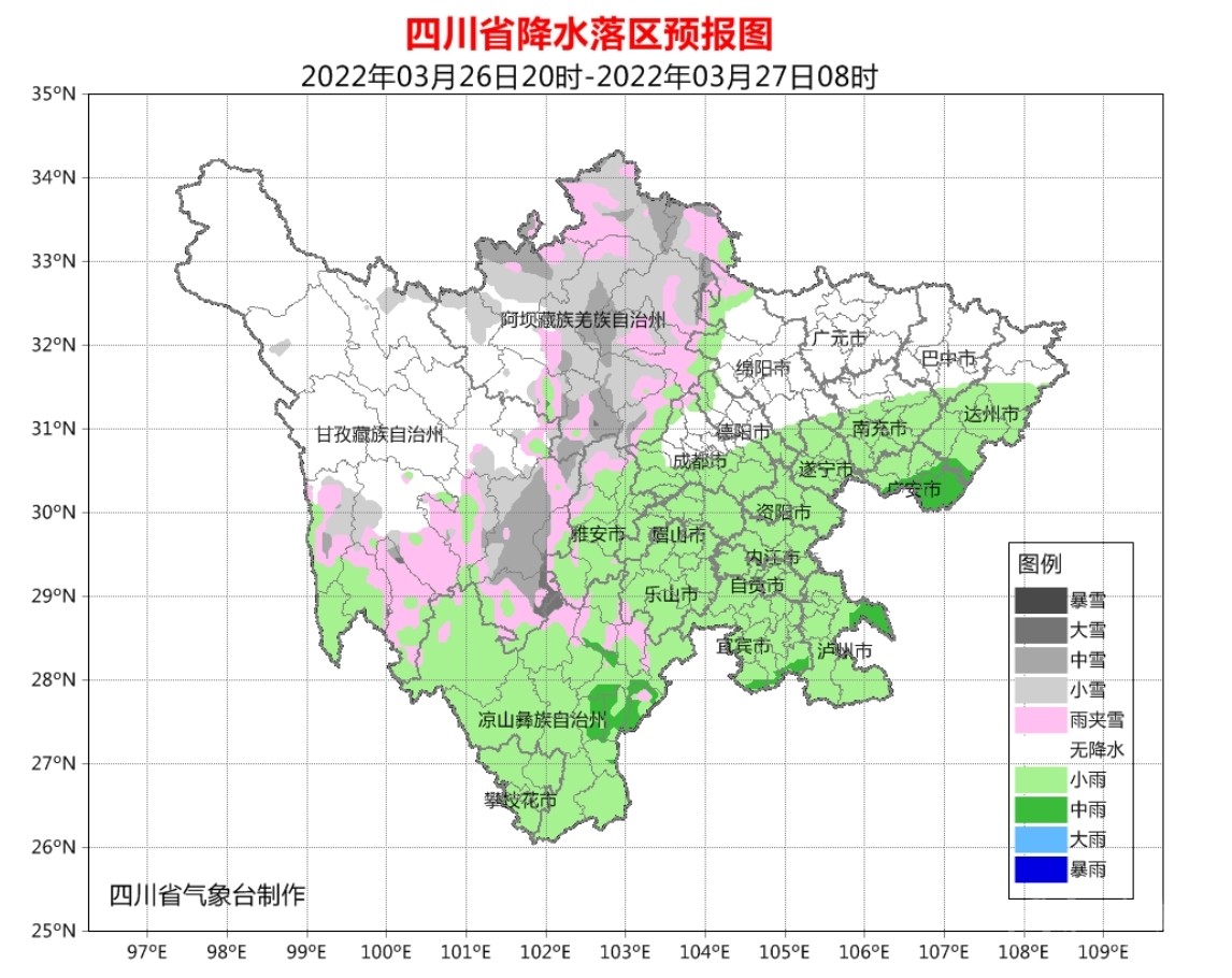 今天晚上:廣元、巴中、綿陽、德陽4市和成都、達州、南充3市北部陰天,盆地其余地方小雨,廣安、瀘州2市局部有中雨;阿壩州大部和甘孜州南部有陣雪(雨),甘孜州北部陰天;攀西地區陰天有小雨,局部地方有中雨。
