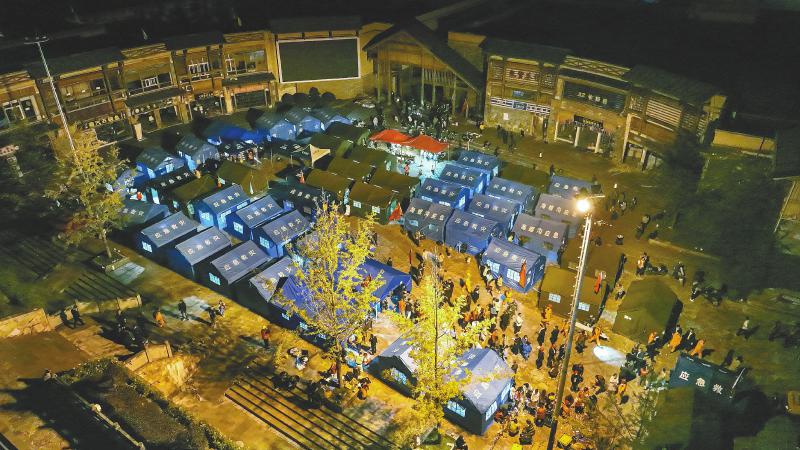 20時10分,救援隊伍終于抵達磨西鎮,在磨西廣場安置點,第一盞燈剛好亮起。