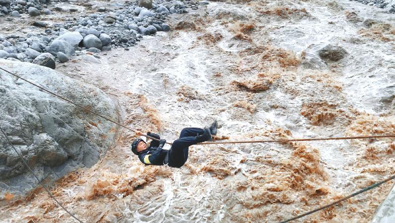 9日早上,在中國安能救援隊的專業支持下,4臺長50米、寬8.3米的應急動力舟橋與1臺無動力登陸“橋頭”組裝成的一座小型浮橋初具雛形,可承載約70噸的重型設備,這將大大提高運送效率。圖為運送設備現場。