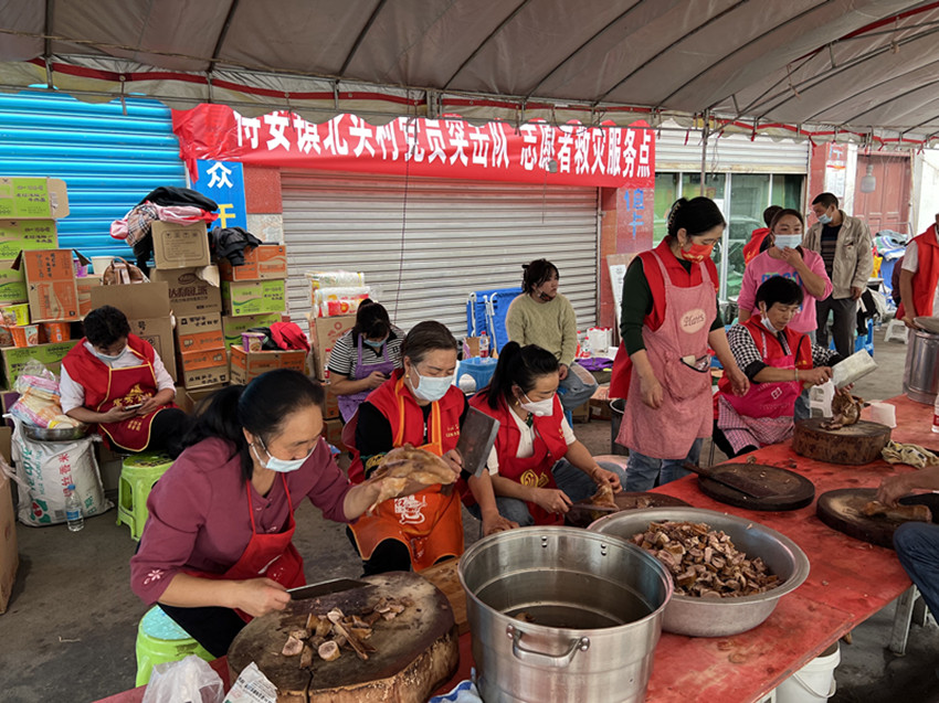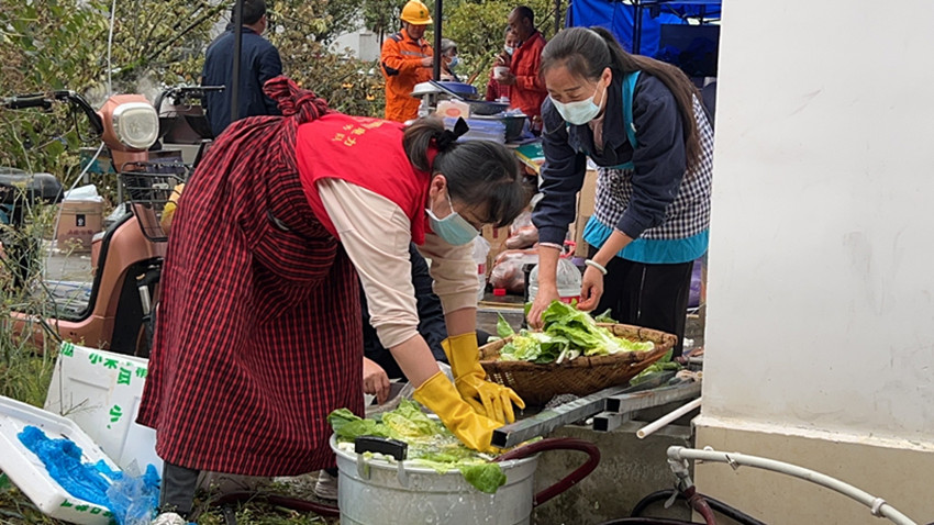 在得妥鎮北頭村的路旁,來自瀘定縣冷磧鎮桐子林村的李星芳和其他志愿者一起忙著切菜煮飯。她告訴記者,地震發生后,我主動報名加入志愿者團隊。“我們這個點上除了政府發放的物資,還有很多附近村民和好心人送來的菜肉和水果,大家都在用自己的行動出一份力。”正在忙著切菜的志愿者洪衛群說。就在記者采訪時,在北頭村開飯館的易姝宏一家送來了鹵菜、排骨和新鮮蔬菜,記賬員茍有成忙著清點數量并記錄在冊。“地震后,爸媽把年邁的奶奶送到瀘定縣城孃孃家,我也向單位請了假,今天我們一起趕回來在這里幫忙”。