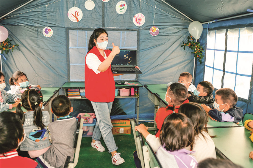 帳篷外,用簡易紙板做成的牌子“青青兒童樂園”特別顯眼,這是首個建在地震震中的兒童樂園。“這頂帳篷中充滿了孩子們的歡聲笑語,這在地震災區就是最動聽的聲音!”青年志愿者毛建美介紹,為了疏導災區孩子們的情緒、減輕家長們的壓力,相關部門專門在這里設置了“青青兒童樂園”,“這里配備5名幼師專業志愿者和3名大學生志愿者陪護照看,開展學習輔導、健康衛生、游戲活動、心靈陪伴、防災減災等五大領域的活動服務。”