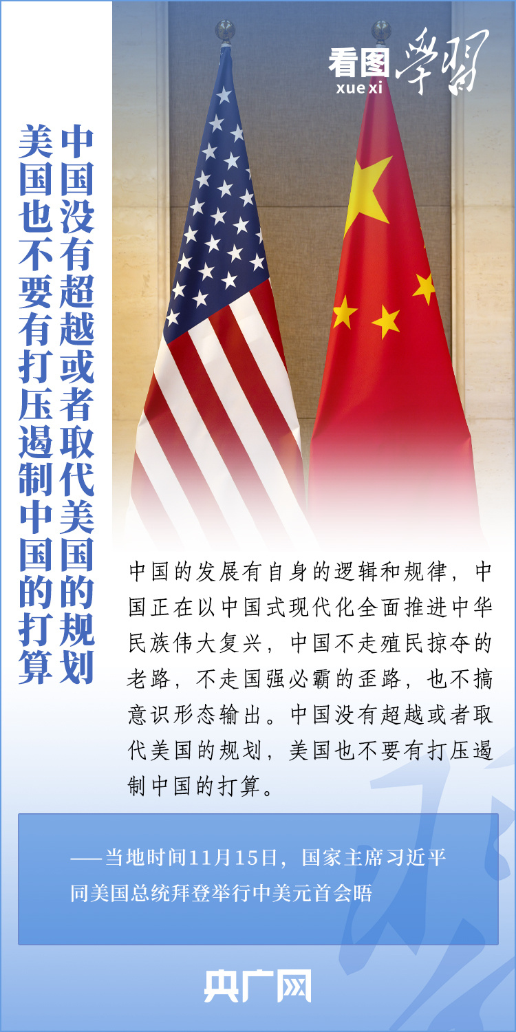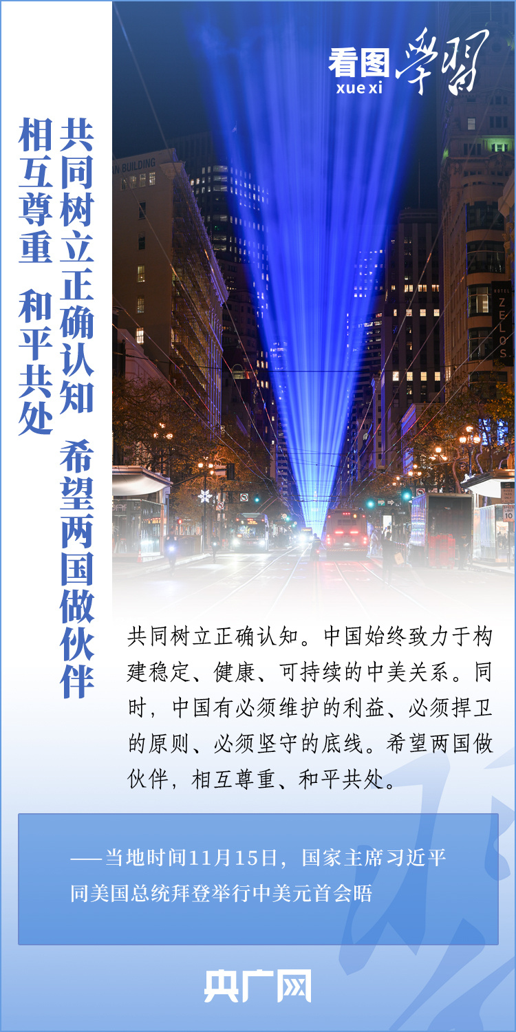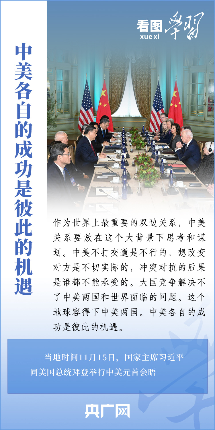 當(dāng)?shù)貢r(shí)間11月15日,國家主席習(xí)近平在美國舊金山斐洛里莊園同美國總統(tǒng)拜登舉行中美元首會(huì)晤。兩國元首就事關(guān)中美關(guān)系的戰(zhàn)略性、全局性、方向性問題以及事關(guān)世界和平和發(fā)展的重大問題坦誠深入地交換了意見。習(xí)近平主席指出,大國競(jìng)爭(zhēng)解決不了中美兩國和世界面臨的問題。這個(gè)地球容得下中美兩國。中美各自的成功是彼此的機(jī)遇。一起來學(xué)習(xí)!