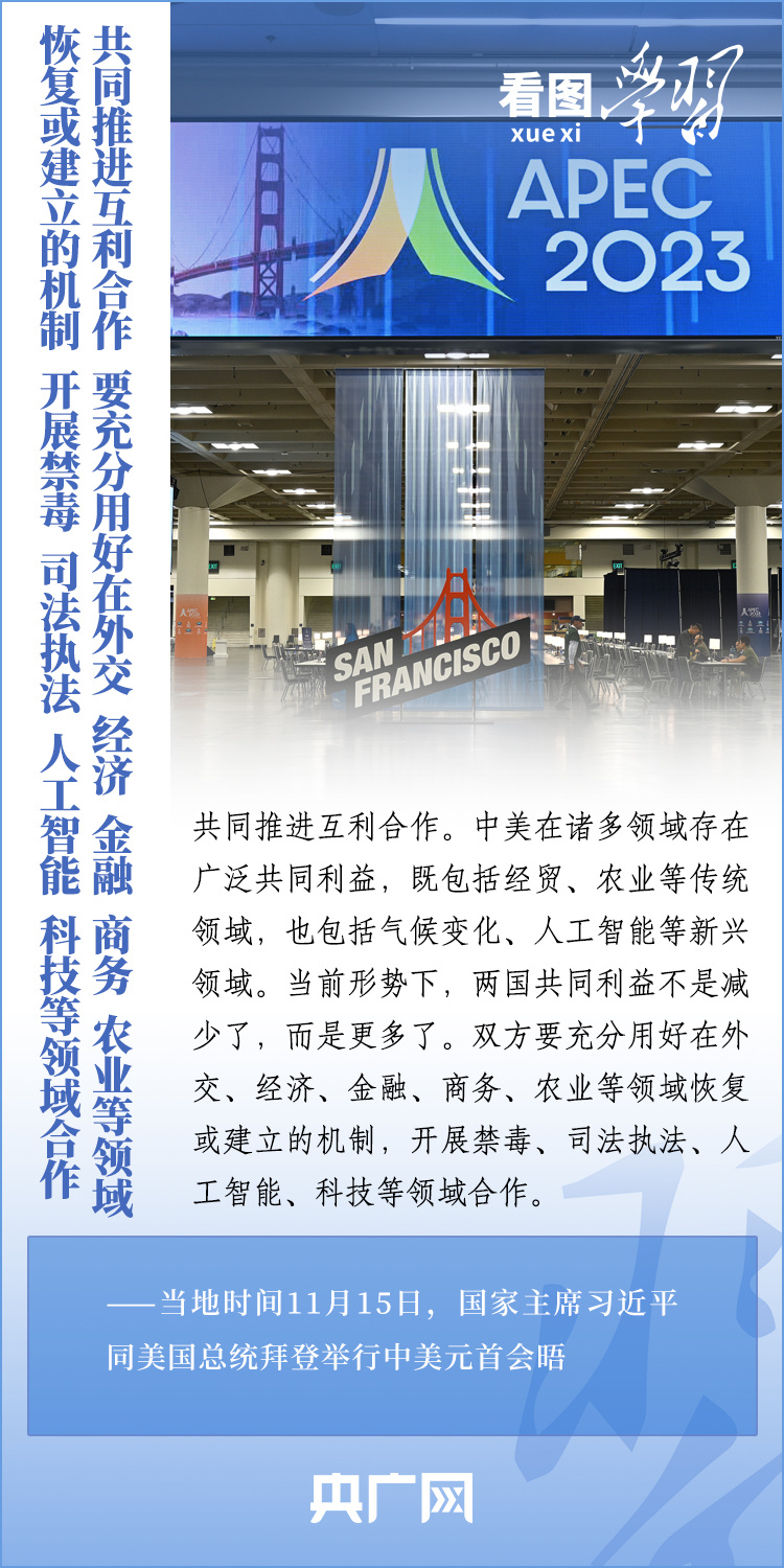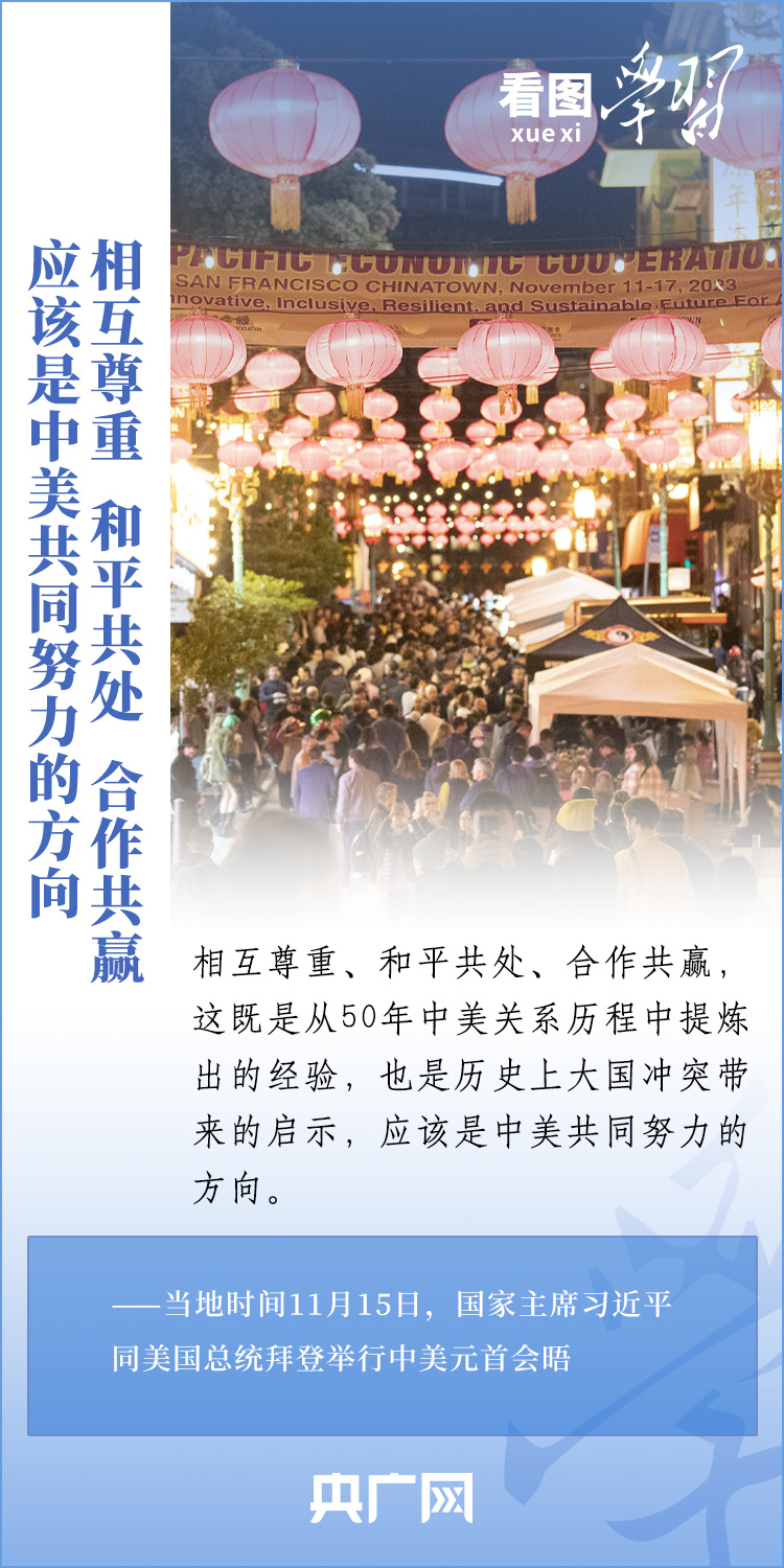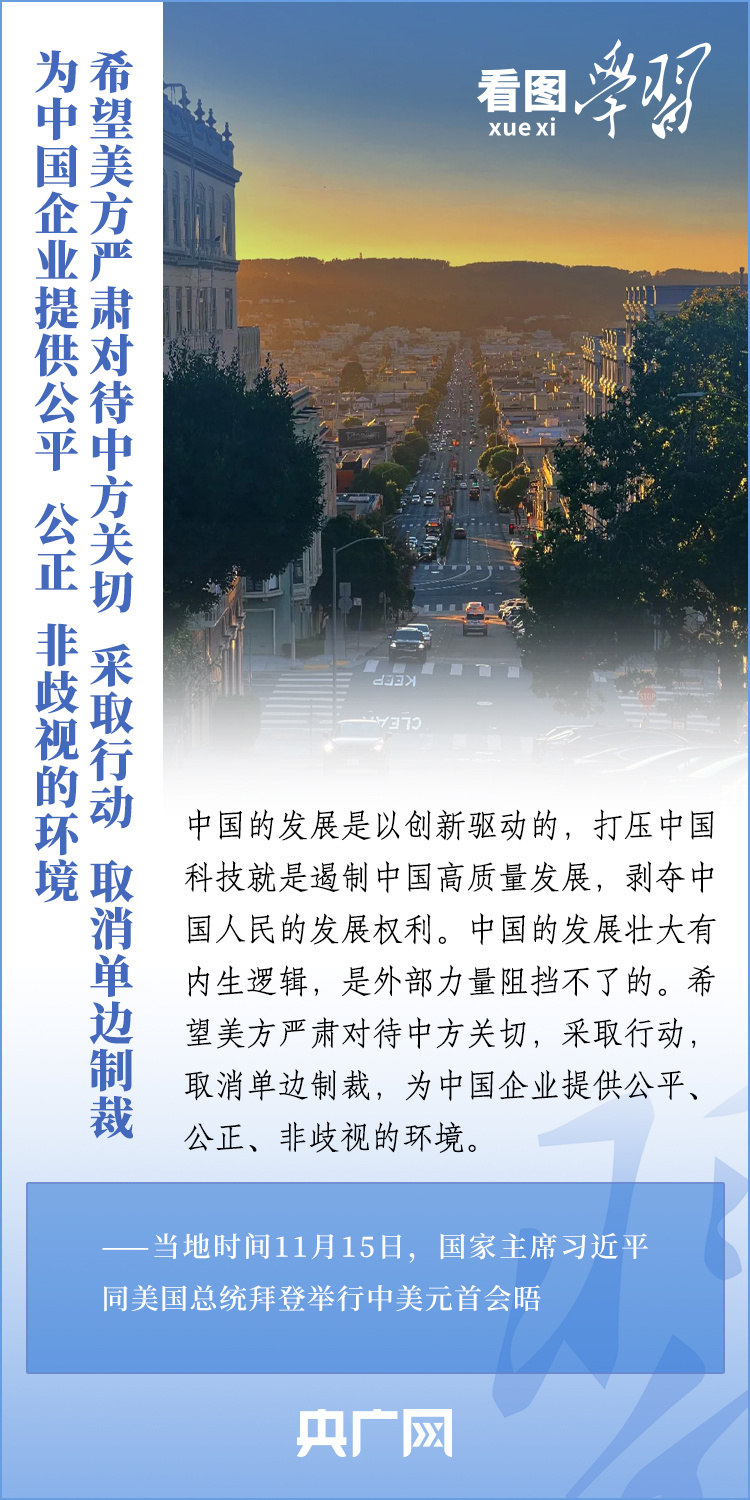 當(dāng)?shù)貢r(shí)間11月15日,國家主席習(xí)近平在美國舊金山斐洛里莊園同美國總統(tǒng)拜登舉行中美元首會(huì)晤。兩國元首就事關(guān)中美關(guān)系的戰(zhàn)略性、全局性、方向性問題以及事關(guān)世界和平和發(fā)展的重大問題坦誠深入地交換了意見。習(xí)近平主席指出,大國競(jìng)爭(zhēng)解決不了中美兩國和世界面臨的問題。這個(gè)地球容得下中美兩國。中美各自的成功是彼此的機(jī)遇。一起來學(xué)習(xí)!