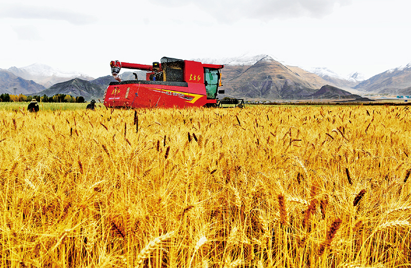 近年來,西藏自治區積極實施耕地改造,通過開展高標準農田建設,全方位提升耕地質量與糧食產量,夯實糧食安全基礎。圖為工作人員駕駛農業機械在拉薩市林周縣曲果強村的高標準農田里收獲小麥(2023年10月12日攝)。 新華社記者 張汝鋒/攝