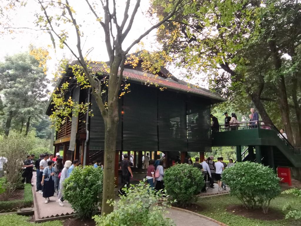 在河內地標巴亭廣場一側,坐落著胡志明陵和胡志明故居。記者抵達廣場時,守衛胡志明陵的儀仗兵正在舉行換崗儀式,眾多民眾和游客高舉相機或手機,記錄下這莊嚴肅穆的一刻。胡志明陵北側的胡志明故居內,各國游客排起長隊,在他曾長期居住和工作的高腳屋下駐足留影。
