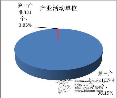 在有證照個體經營戶中,第二產業占3.01 %;第三產業占96.99 %。有證照個體經營戶從業人員中,第二產業占3.82 %,第三產業占96.18 %。