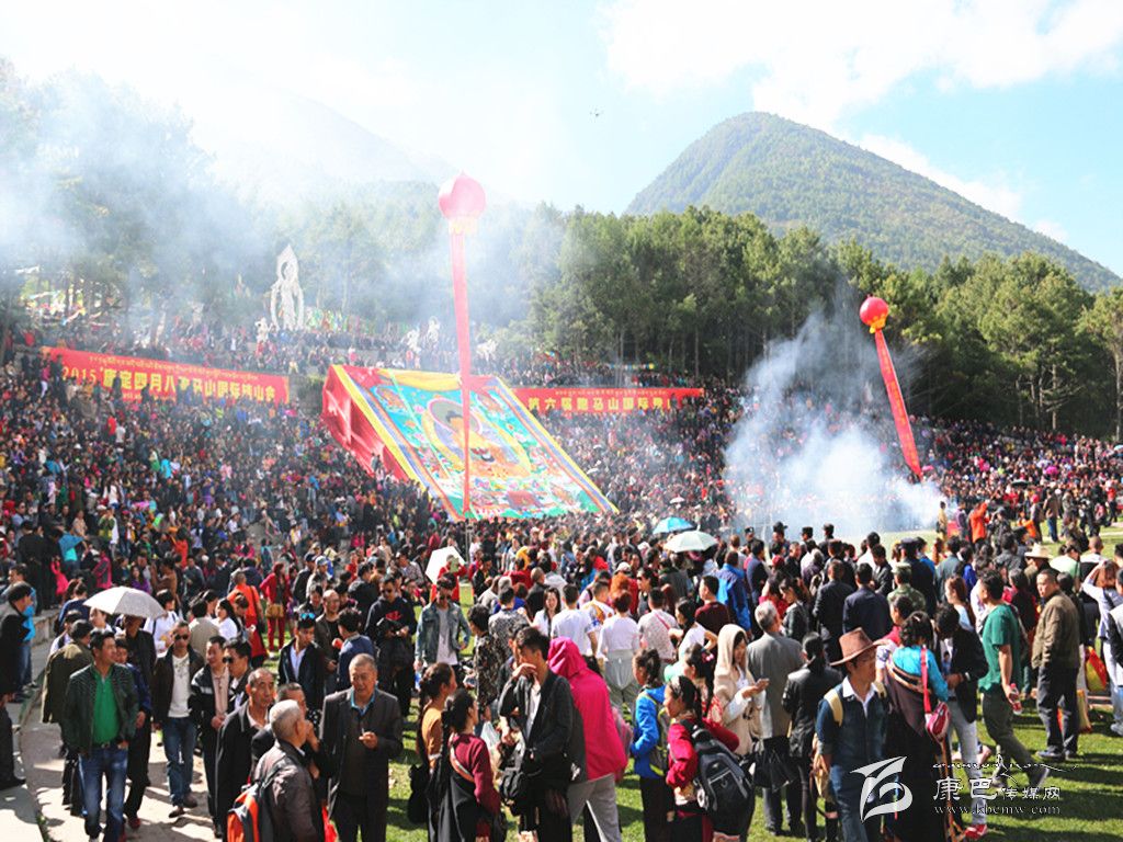 清晨的跑馬山桑煙繚繞、龍達翻飛,在寬敞的跑馬山情歌坪上人頭攢動、彩旗飄揚。四面八方的賓客紛至沓來,近萬名觀眾把情歌坪里三圈外三圈圍了個水泄不通。早晨九時許,在陣陣法號和僧侶的誦經聲中,莊嚴、隆重的“四月八”曬佛儀式拉開了系列活動的序幕。在人們的熱切期待中,釋迦牟尼的巨型唐卡畫緩緩展現在人們眼前。來自自貢的游客劉女士說:“早就聽說康定‘四月八’轉山會了,今年終于和家人來到了情歌城。我們早上6點多就起床登上跑馬山,只為觀看這里特有的佛事活動。這幅釋迦牟尼唐卡像真大啊!法號聲和僧眾們祈禱頌唱聲,場面壯觀,讓人震撼。”同樣,來自山東的小陳也被濃烈的儀式氣氛所感染,手中的相機就沒停下過,“我們很幸運,到這里旅游能遇上這樣原生態的傳統文化節日,康定山美、水美,民族文化魅力更是無窮,這趟旅游值了。”