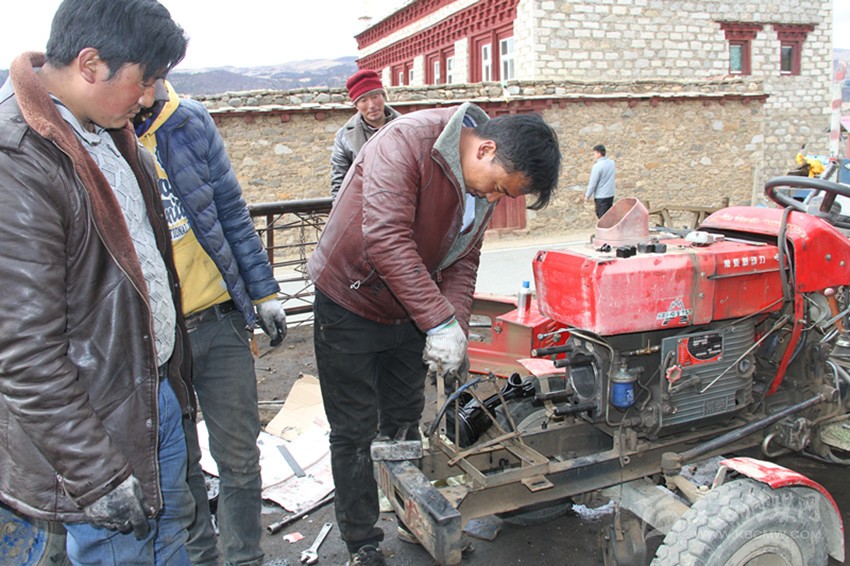 2月21日,遠(yuǎn)離理塘縣城83公里、海拔3560米的下木拉鄉(xiāng)細(xì)忠村,天氣還有些寒冷,扎西維修店店長(zhǎng)壓瑪帶領(lǐng)徒弟正忙著為村民維修拖拉機(jī),因?yàn)榇焊诩吹⒄`不得。