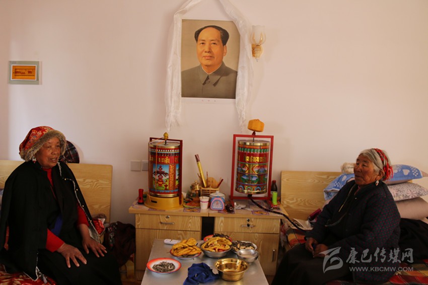 從餐廳出來,記者走進了一間15平方米左右的宿舍。兩位老人正坐在各自的木床上看電視,墻上掛著的液晶電視是連著機頂盒的。兩床之間,放著藏桌和床頭柜,藏桌上有瓜子、花生、酥油果子、牛肉等食品,亞瑪翁青老人熱情地說:“因為正在過藏歷新年,這些都是福利院為我們備的年貨,你也嘗嘗!”。房間里最引人注目的便是掛在床頭柜上方的系著哈達的毛主席畫像,兩位老人指著毛主席畫像動情地說:“毛主席、共產黨是我們的恩人,看著他的畫像我們安心。”此外,房間里還有衣柜、配有馬桶的獨立廁所和盥洗臺,毛巾、漱口盅、掃把、拖把都整齊地放在對應位置。亞瑪翁青笑著說:“我們住的房間都趕得上縣城里的賓館了。”