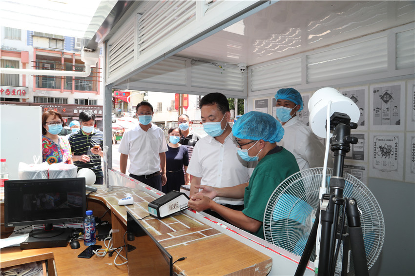 圖為快遞工作人員正在為取件群眾測量體溫。