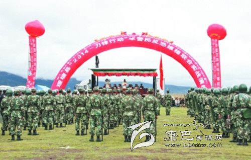 為進一步提升理塘縣各維穩力量應急響應、協同配合和聯合處置能力,并形成強大威懾,理塘縣于6月21日集中開展了“2014——刀鋒行動”軍警民反恐維穩聯合實戰演練。演練分為演示性演練和綜合性演練,通過演練達到了預期效果。圖為演練現場。  (葉強平 攝影報道)
