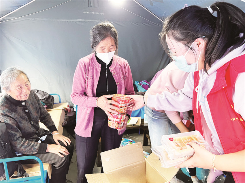 身穿紅色背心的志愿者向受災群眾發放食品。