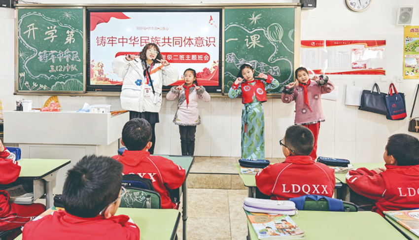“各民族要像石榴籽一樣緊緊抱在一起”“中華民族一家親、同心共筑中國夢”“共同團結奮斗、共同繁榮發展”……走進瀘定縣瀘定橋小學,隨處可見鑄牢中華民族共同體意識的宣傳語。校園內民族團結進步主題黑板報、自制民族團結手抄報和五十六個民族一家親的畫作等讓人目不暇接。