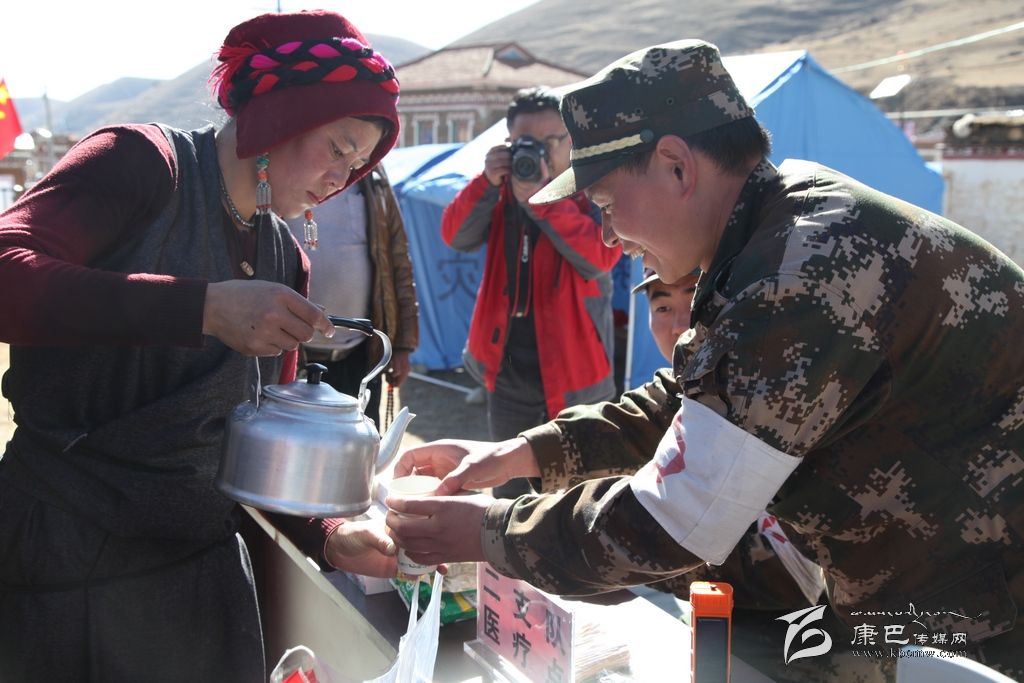 在江巴村牧民新村安置點(diǎn),有兩位牧民婦女手里提著茶壺,她們后面跟著一位小女孩懷里抱著很多紙杯,見到有忙碌的抗災(zāi)工作人員,她們就會(huì)為他們送上慢慢一杯噴香熱乎的酥油茶,嘴里一直念叨著:“你們辛苦了,感謝你們!”
