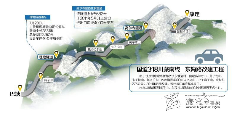 國道318川藏南線是四川進藏大通道之一,也是甘孜藏族自治州境內極其重要的交通主干道之一。2011年啟動建設的東海路改建工程,按三級公路標準改建,起于甘孜州康定市新都橋鎮東俄洛村,翻越高爾寺山、剪子彎山、卡子拉山、托洛拉卡山四座海拔4000米以上高山,止于海子山,全長約275公里。