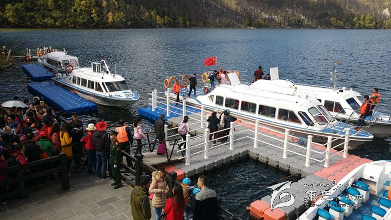 “十一”黃金周期間,康定市木格措景區,游客正在有序排隊等待乘船。