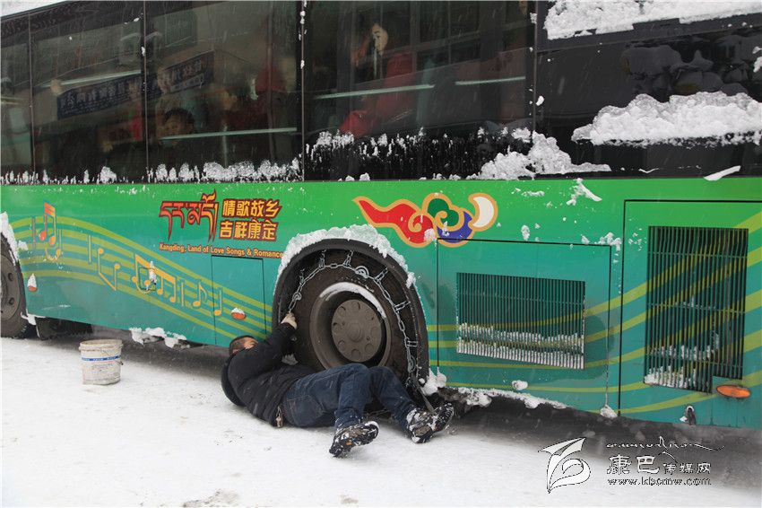 早上8點,正值上班高峰期。記者發現街道上的私家車比以往少了許多,公交車上則人滿為患。在州武警招待所附近記者發現,為了應對積雪,過往的車輛都不得不掛上防滑鏈小心行駛。在現場,一輛有防滑鏈的公交車仍然在打滑。見到這一情景,另一輛公交車不得不停在康定市東大街小學后面的街道上掛防滑鏈條。車后的人行道上,一位叫志瑪的環衛工人正在費力的清理積雪。她告訴記者,早上6點過鐘她就上街清雪了,但由于積雪太厚,兩個多小時的時間才挖出一段不到500米的“雪路”。在與她相距100米左右的地方,有一群年輕人邊清理積雪、邊打雪仗,還順便堆起了一個大雪人。在康定將軍橋農貿市場,菜販們照常在搬運蔬菜,一輛川T牌照的小貨車則停在街邊,車上滿是新鮮蔬菜,看來這場雪對他們的影響并不是很大。市場外的公交車候車點,候車的人們排起了長龍。