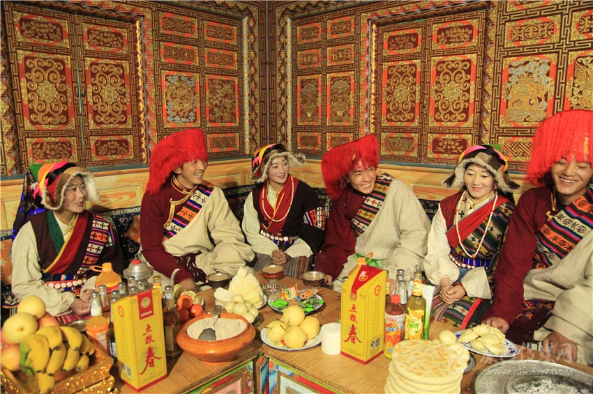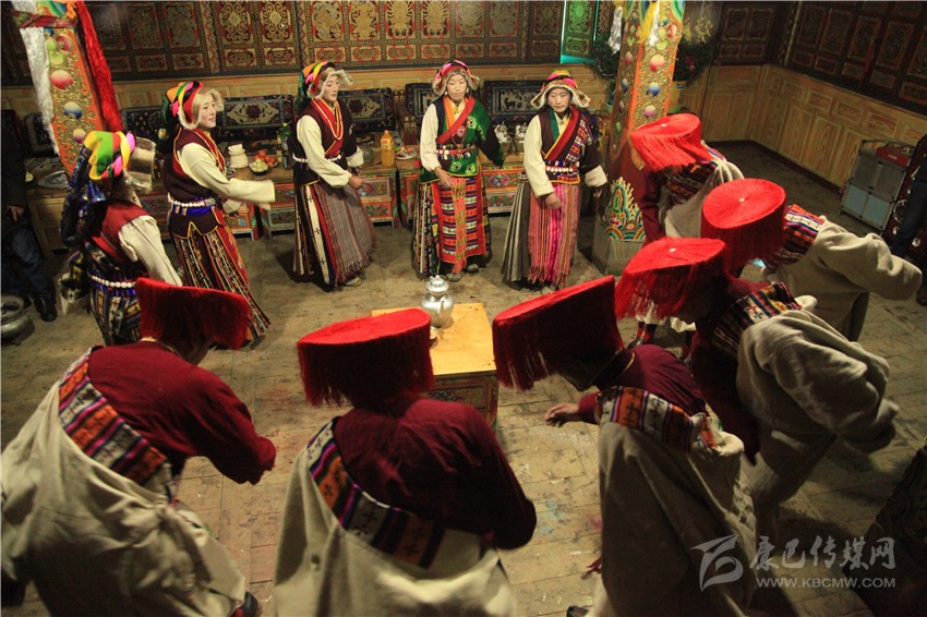 一家人穿上節(jié)日盛裝,按輩序就座。主婦手捧吉祥斗恭恭敬敬地走到長(zhǎng)輩跟前說(shuō)“扎西德勒”,對(duì)方抓幾粒麥子邊向上撒邊祝福說(shuō):“扎西德勒!美滿幸福,祝主婦身體健康,預(yù)祝明年大家仍如此團(tuán)聚歡慶。”再抓一點(diǎn)切瑪送進(jìn)嘴里。家庭儀式后,家中兩人一個(gè)拿青稞酒、銀酒碗,一個(gè)手捧切瑪,到左鄰右舍、親朋好友家拜年,敬獻(xiàn)切瑪、青稞酒,互相祝福。