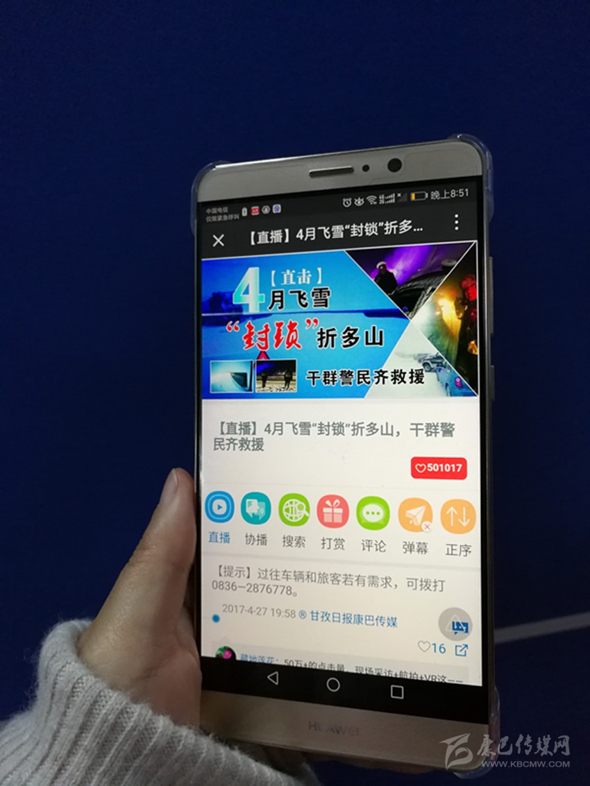 一路上,記者通過甘孜日報微信平臺,將救援情況和群眾的實況,第一時間進行了直播。隨著一條條現場圖片、文字和視頻的及時發布,人們第一時間得知了折多山受困車輛和群眾得到救助的實際情況,人們紛紛在直播平臺留言,為交通、路政和當地黨委、政府的救援行動點贊。在對折多山強降雪和受堵現場進行直播報道的同時,甘孜日報社還利用直播平臺,回顧了折多山道路交通難的歷史,并再次發布雅康高速修建、折多山隧道立項等重大交通建設工程的進展情況,又對此次折多山風雪阻斷道路交通,導致車輛和人群滯留的特殊原因進行了報道和澄清,并報道了風雪中仍有不少徒步游客繼續甘孜之旅的情況,第一時間讓更多的人了解到,飛雪并未對道路造成致命影響,甘孜州的道路交通狀況和應急處置能力已經得到了極大的提升,完全有能力保障人們出行以及生命、財產安全。