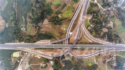 上午11時許,當記者驅車到達對巖樞紐互通立交,用無人機從空中俯拍,這個縱橫交錯、恢弘磅礴的交通樞紐,宛如盤旋在云端的銀龍,又似在大地上延伸的血脈,其造型、規模、結構都令人嘆為觀止。