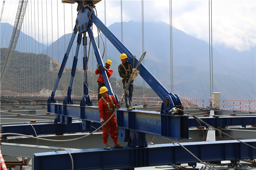 興康特大橋作為高海拔、高地震烈度山區和復雜風場環境下世界第一超大跨徑鋼桁梁懸索橋,面臨的最現實的困難就是復雜風場。4月1日下午,大橋建設現場連綿不絕的大風如期而至,工人們系上安全繩,迎著大風,對新吊裝的材料一個螺絲一個螺絲的擰緊。