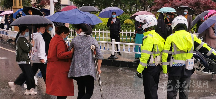 這邊剛幫助考生尋回遺失的準考證,那邊一名杵著拐杖的考生引起了執勤交警的注意,這時這名考生在家長的攙扶下正準備過馬路,交警見狀,立即上前為其疏導交通,開辟出綠色通道。記者了解到,這名考生叫段尚玲,兩周前意外摔傷了腿,這給她的應試之路帶來了不少麻煩,幸好在交警的幫助下,她安全順利地進入了考場。