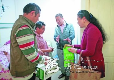 雖然大家都在獻愛心,但這點錢也顯得杯水車薪。結對認親小分隊回到報社后,立即向報社黨委作了匯報,第二天中午,報社派出人員代表黨委、編委會、結對支部和全體職工,到州人民醫院探望蘇國全,這才出現了本文開頭的一幕。在病房照顧蘇國全的妻子和女兒看見“親戚”單位來了人,眼里閃動著激動的淚光。“這幾天借來的錢都要用光了,如果停藥就會有危險。”蘇國全的妻子饒大姐說。報社領導安慰她說,“不要急,我們大家一起想辦法。”并將全社職工捐贈的10000元現金交到她的手中。當她從報社領導手中接過愛心款時,母女倆的淚水奪眶而出,連聲感謝。