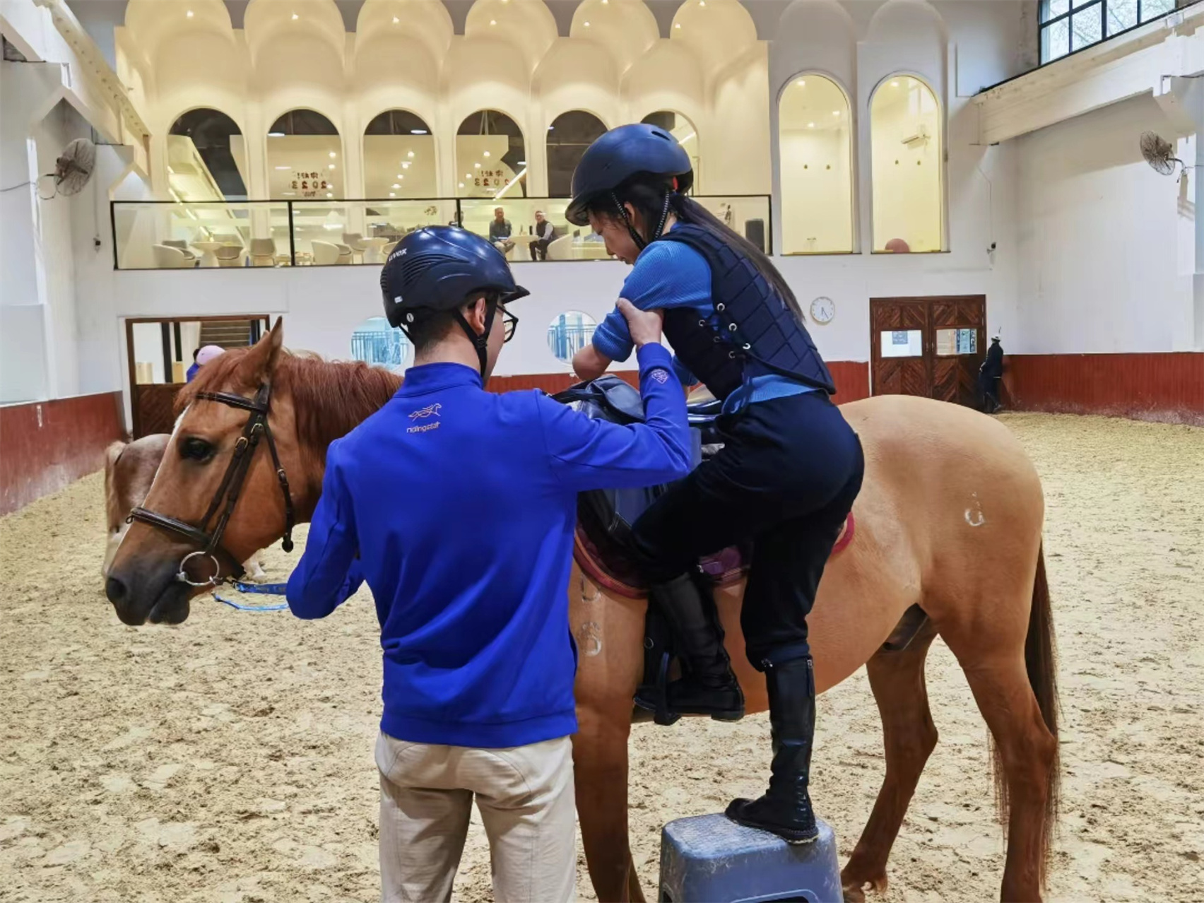 “控韁需要較強的手臂力量,對于許方燕來說,不僅下肢的力量需要強化,上肢的平衡又頗具難度?!眲傞_始接手訓(xùn)練許方燕時,此前從來沒有帶過特殊人群的教練鄧思成坦言有些頭疼。為了幫助許方燕克服身體障礙控制馬匹,鄧思成不僅為她量身定做了特制的帶有卡扣的韁繩,還為她量身定制了訓(xùn)練計劃,尤其加強了韁繩脫落等意外情況的訓(xùn)練。