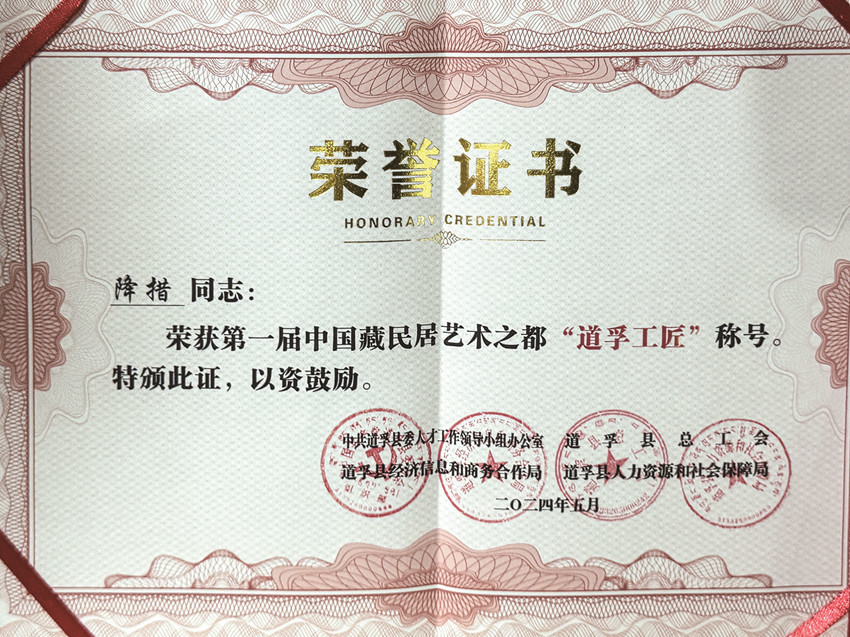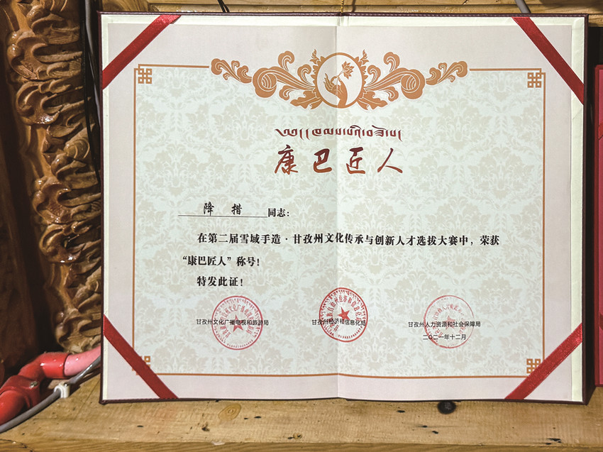 道孚縣孔色鄉(xiāng)瓦依村的降措從小酷愛(ài)藏紙文化,2008年,在降初扎巴老師處系統(tǒng)的學(xué)習(xí)了造紙工藝,2021年,獲得了州級(jí)非遺傳承人榮譽(yù)稱號(hào),同年12月,在康巴文化大賽中獲得了“康巴匠人”榮譽(yù)稱號(hào)。