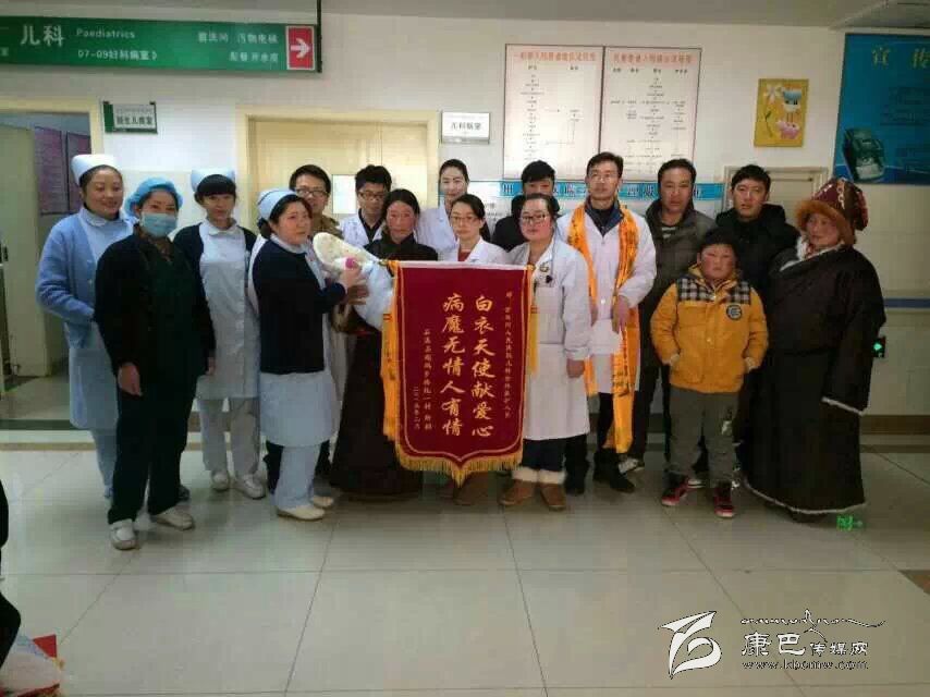 懷抱那胖乎乎、體重已經增至2.9公斤的健康小寶寶,小家伙的母親雙眼流出了感激的淚花,她伸出大拇指,不停地“卡措、卡措(謝謝)”點頭致謝。為了表達感激之情,家人還特地送來了一面錦旗,上面印著“病魔無情人有情,白衣天使獻愛心”。