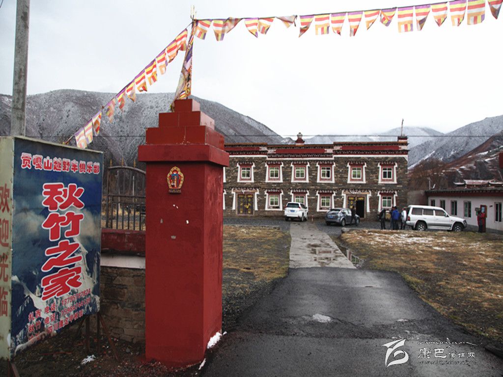 在距鄉政府不遠的營九路邊上,有一個“貢嘎山越野車俱樂部·秋竹之家”的燈箱廣告。在雪山的映襯下,這個不大的燈箱廣告顯得格外引人注目。步入“秋竹之家”的大門,進入眼簾的是一幢民族風格濃郁的建筑,黑白紅三色相間的墻面,還沒有吐綠的院壩,所有的一切,都讓記者看不出這幢建筑與普通民居有什么不同的地方。