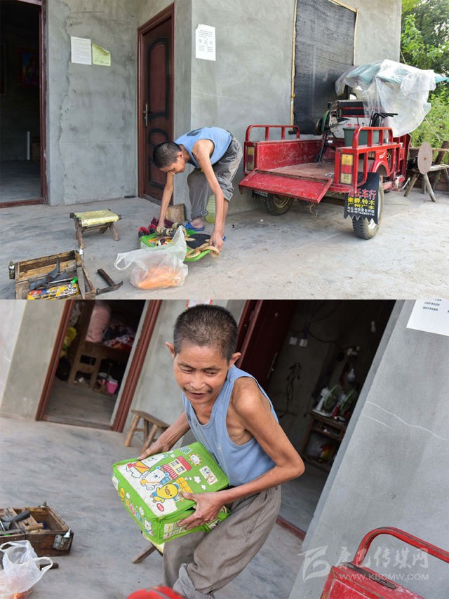 “周強善曾是全鄉最困難的貧困戶。”中心鄉黨委書記楊壘說,周強善的妻子在剛生下女兒后因病去世。2005年,他在外務工時右腿受傷,留下殘疾。后來他自學補鞋技術,成了一名鞋匠,但腿腳不便、下山路不通,三娃多年“悶”在家里。