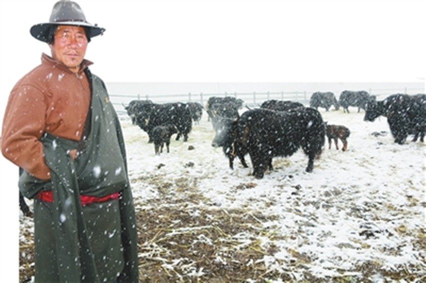 5月8日,甘孜縣達通瑪片區大雪飛揚。在茶扎鄉銀多村集體牧場,放養人員格絨正在給上百頭牦牛喂草料,他喜滋滋地說,通過牧民儲備和農牧農村局提供草料的方式,牦牛可以安全過冬。銀多村現代化集體牧場合作社成立一年多的時間,共出欄牦牛16頭,總收益67380元,除去20%預留金,村民有了一定的收入,而作為放牧人員,他管理了52頭牦牛,一年有1.2萬元的收入。