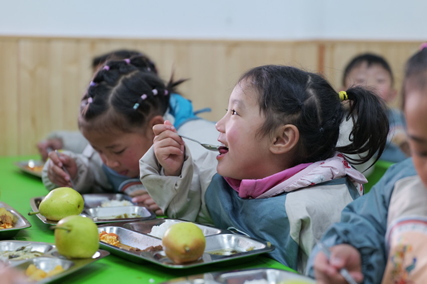 本網訊 排骨燒土豆、西紅柿炒雞蛋、紫菜雞蛋湯、酥梨……近日,在德格縣城關第一幼兒園,葷素搭配、選擇多樣、營養均衡的餐食深受孩子們喜愛。幼兒彭措占瑪說:“我最喜歡吃幼兒園的飯菜,可好吃了!”