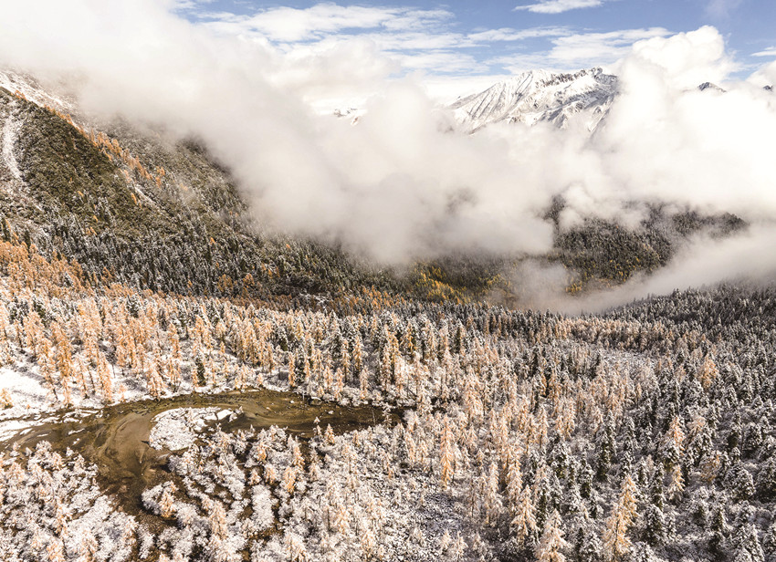 雪山、藍天白云和黨嶺村的彩林構成一幅優美的畫卷。新華社 發