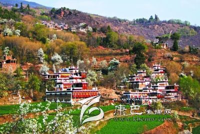 民居外表主要由棕白兩色構成,白色的屋頂,白色的主墻,木結構處多用棕色顏料染涂,其間配以紅、藍圖案,在藍天、白云、青山、綠水的映襯下,幻化成妙不可言的積木圖案。白色的房頂與寬敞的院壩里,身著艷麗藏裝的少女或身著絳紅色衣衫的喇嘛飄拂其間,給人一種“世外桃源”的感覺。